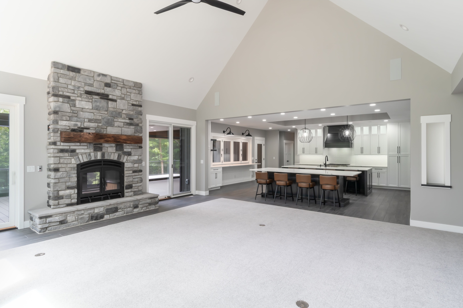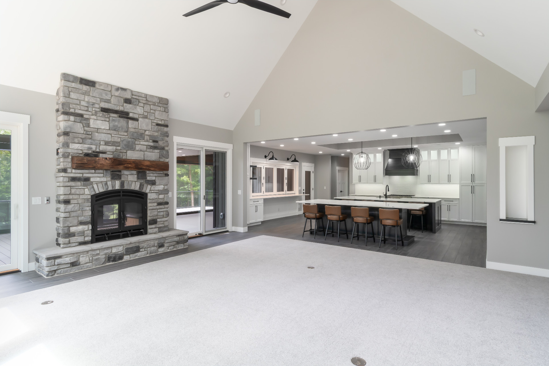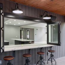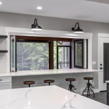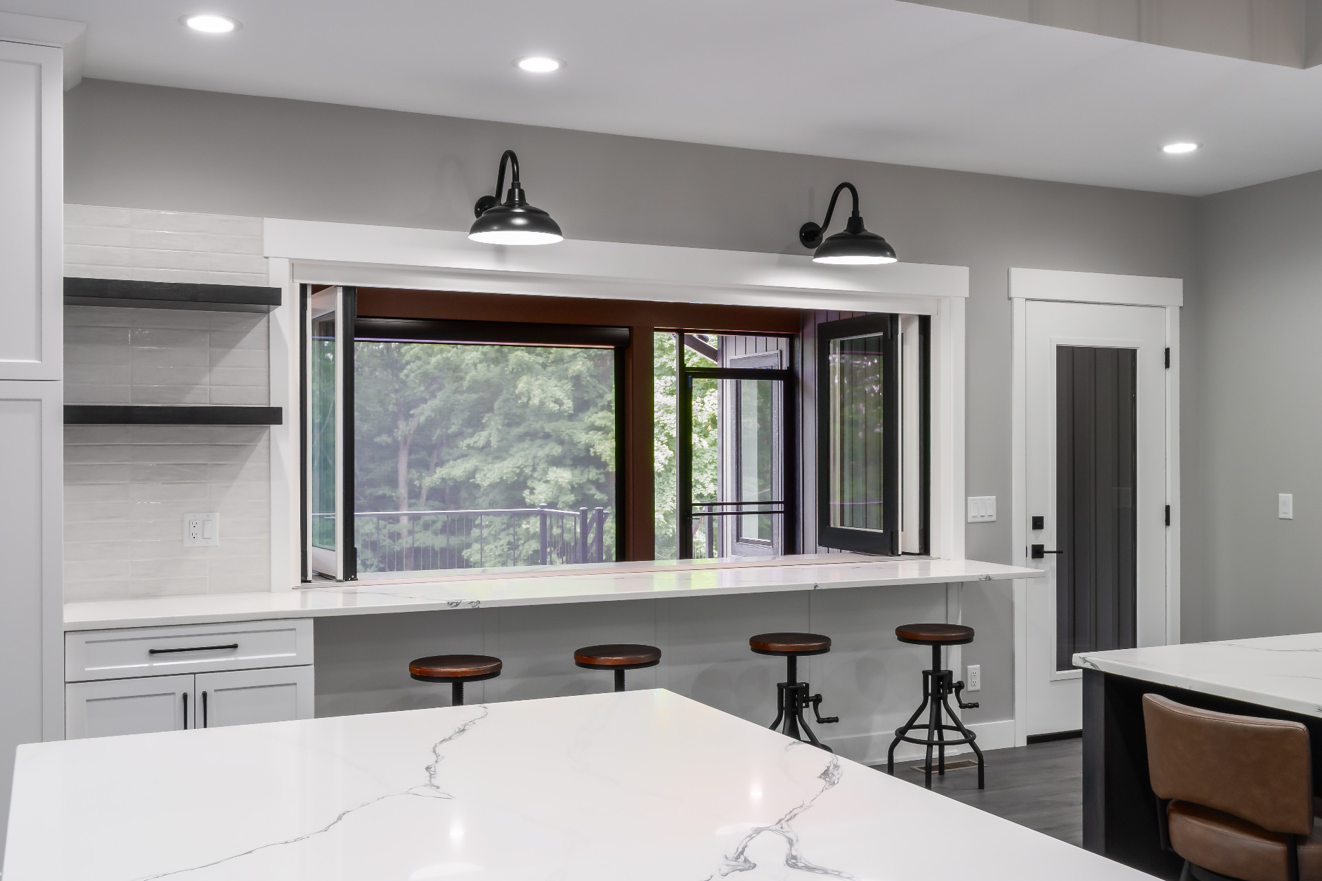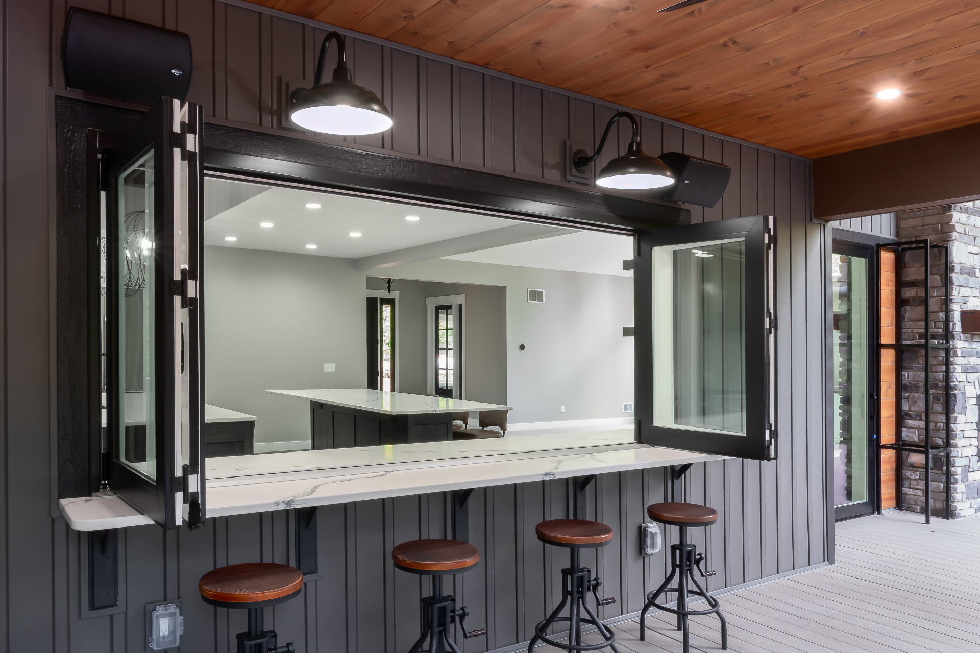 Large windows frame serene woodland views while flooding the interiors with natural light. The heart of the home features a stunning kitchen with a unique oversized pass-through window that serves both the indoor gathering space and the expansive outdoor living area—ideal for entertaining or savoring quiet mornings in nature.