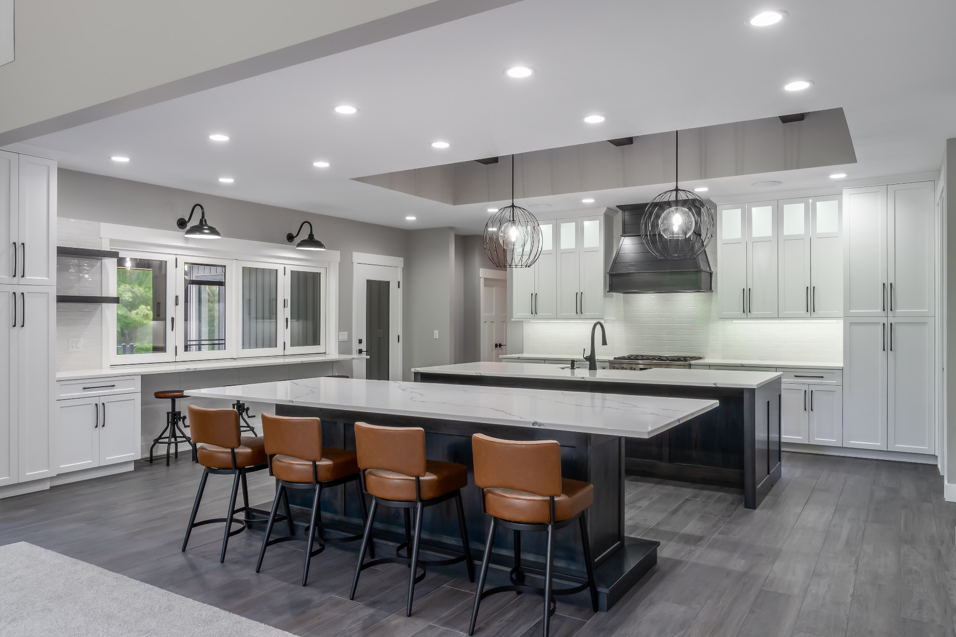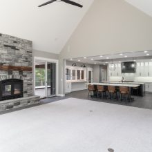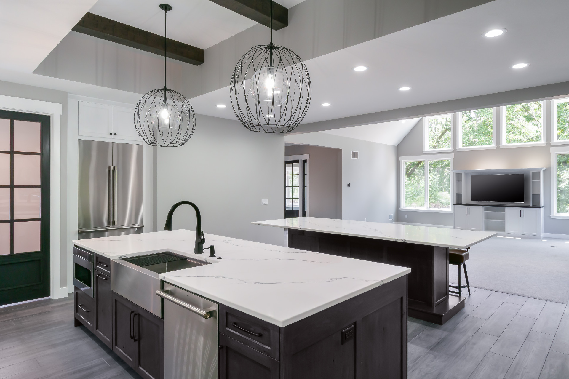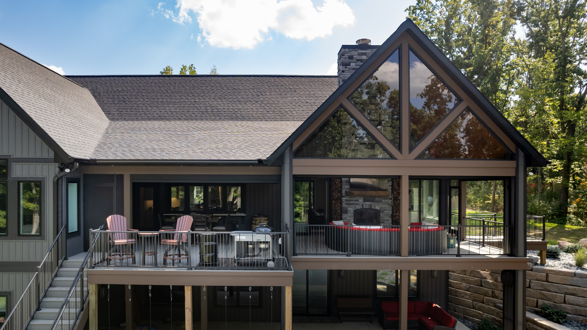 Large windows frame serene woodland views while flooding the interiors with natural light. The heart of the home features a stunning kitchen with a unique oversized pass-through window that serves both the indoor gathering space and the expansive outdoor living area—ideal for entertaining or savoring quiet mornings in nature.