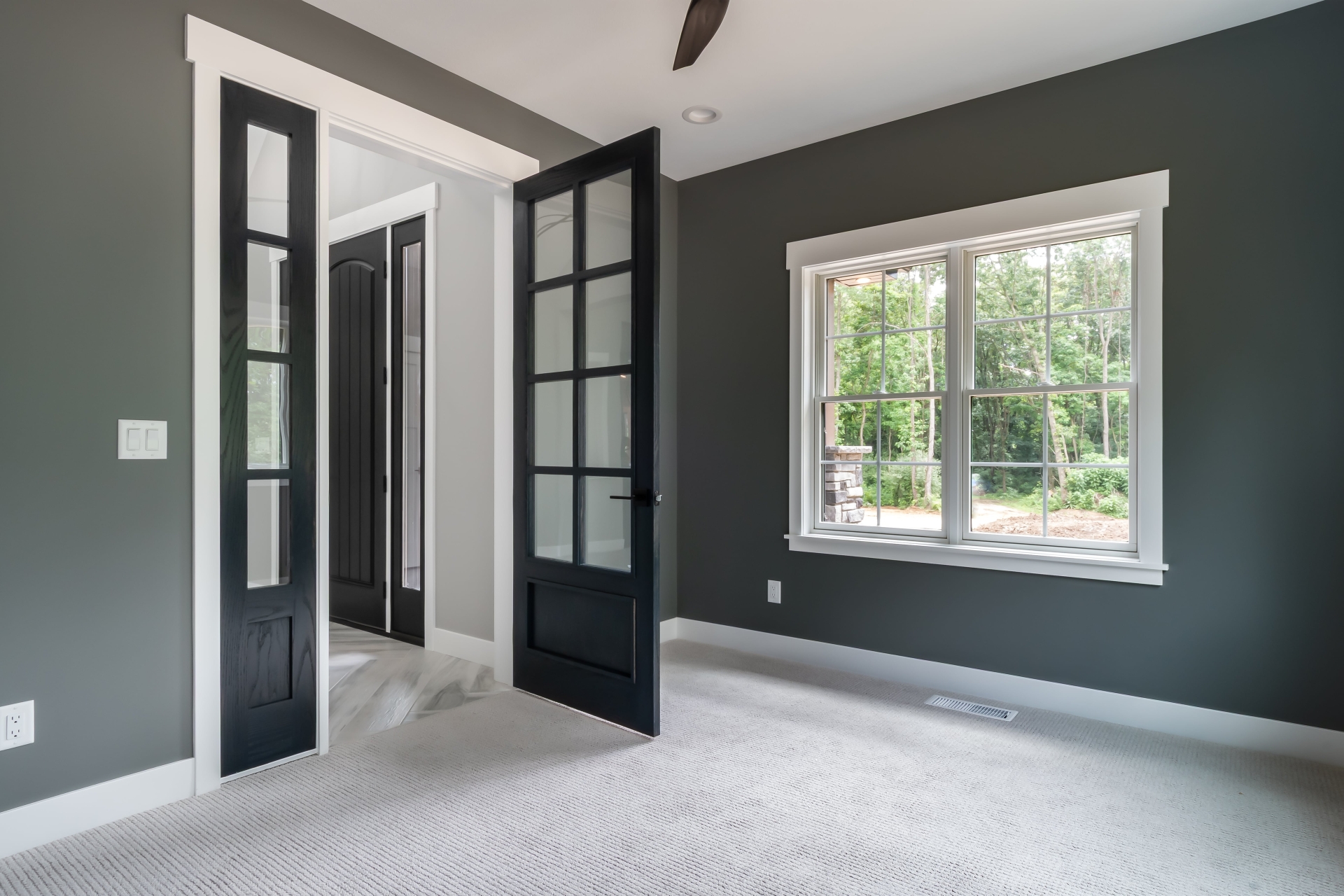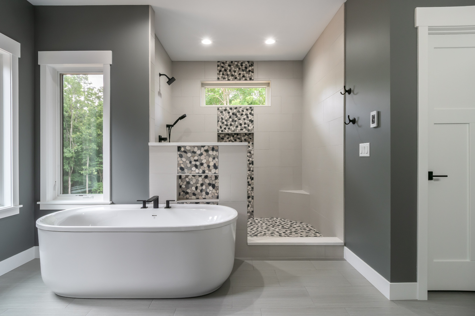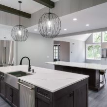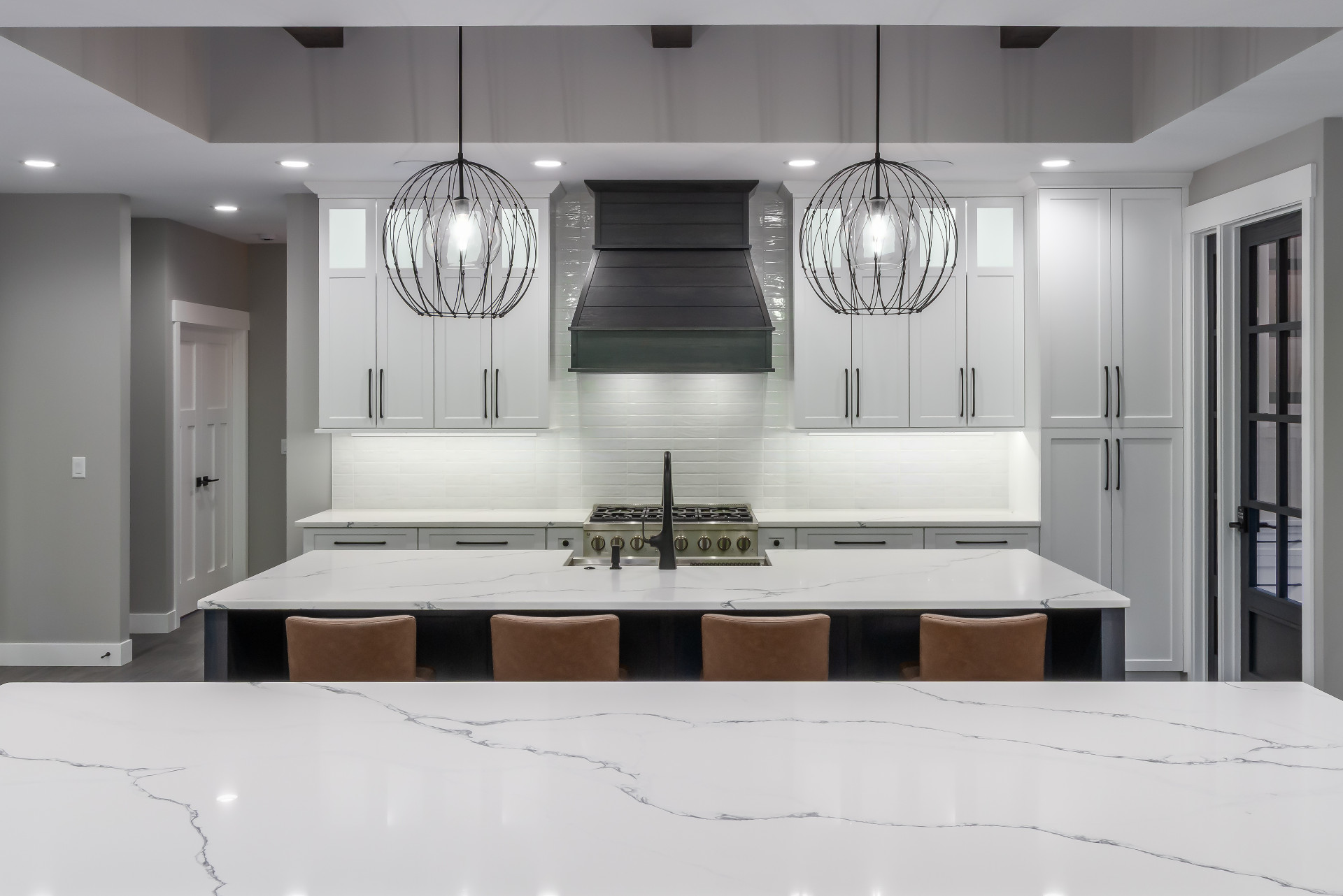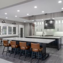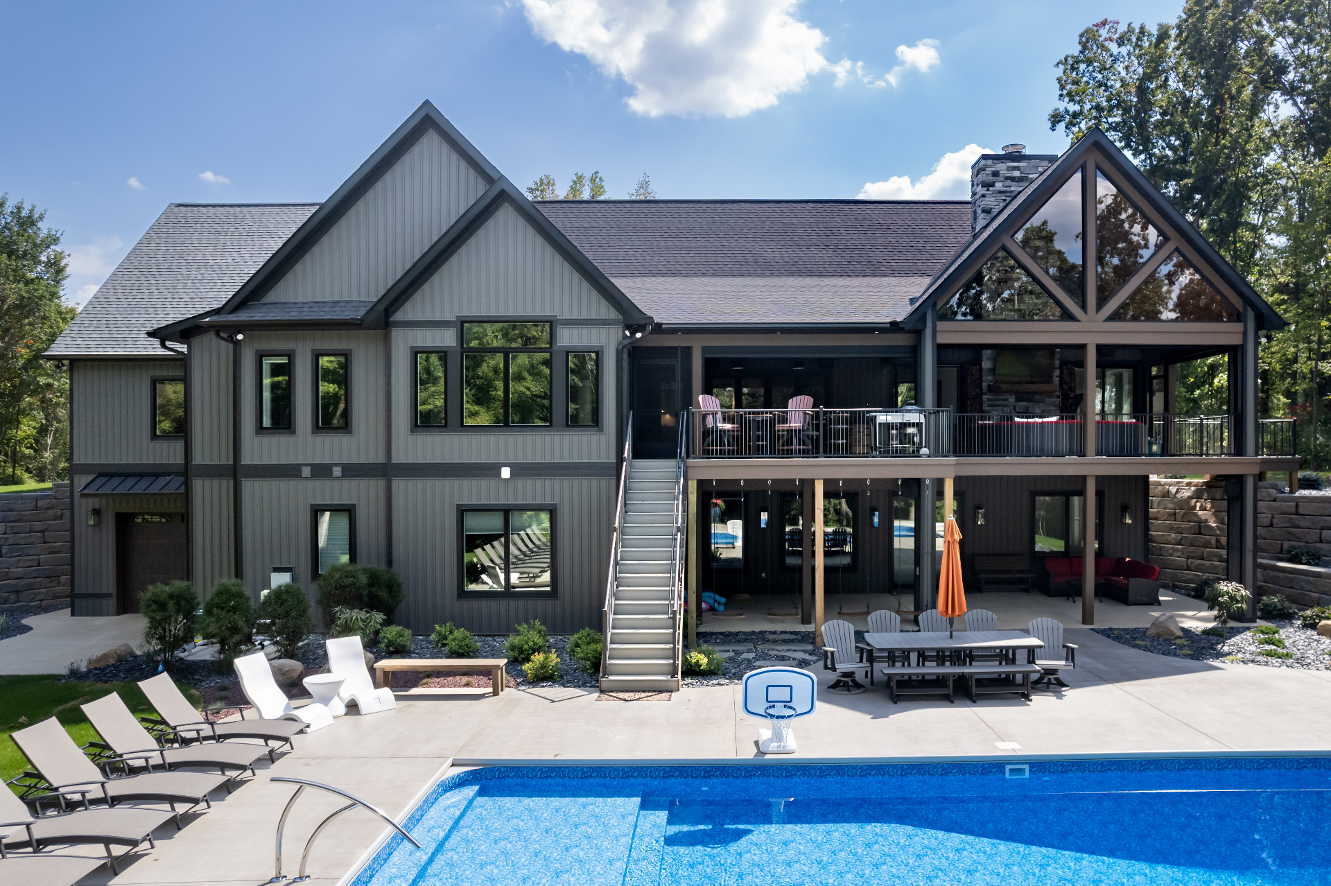Large windows frame serene woodland views while flooding the interiors with natural light. The heart of the home features a stunning kitchen with a unique oversized pass-through window that serves both the indoor gathering space and the expansive outdoor living area—ideal for entertaining or savoring quiet mornings in nature.
